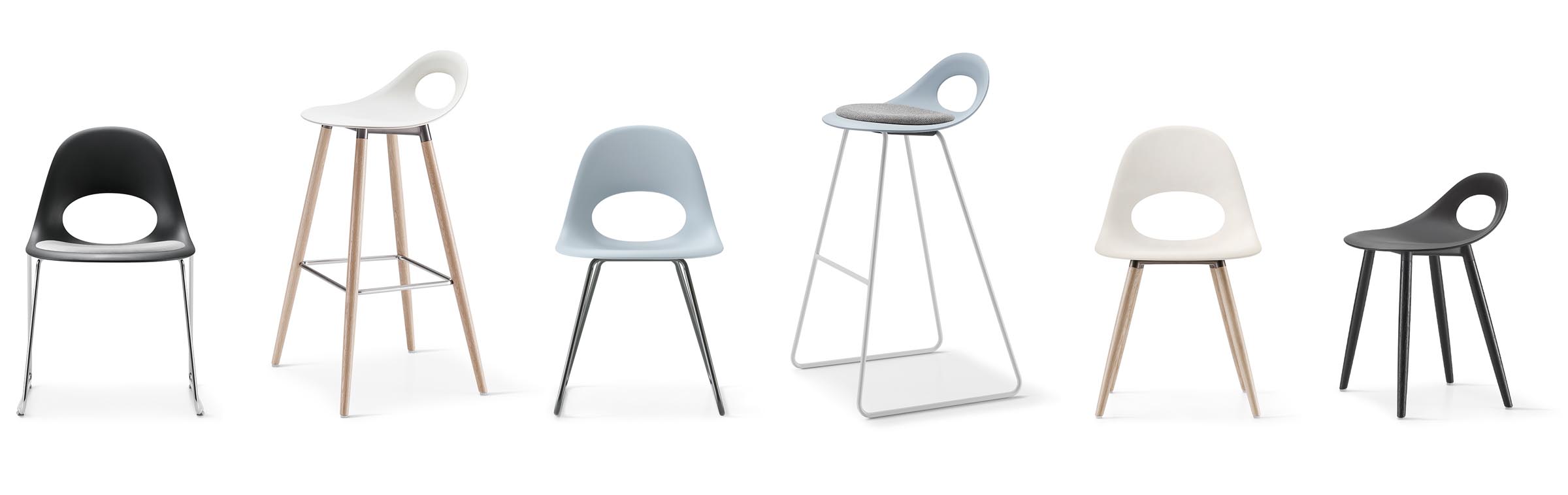 The light-scale of Say O has proportions carefully crafted to allow for optimal strength, ergonomics, and an eye-catching character with its ‘O’ shape cutout. The distinctive shells of Say O Poly Chairs & Stools are offered in white, black and grey blue. Metal frames can be powder coated in 16 colors.
